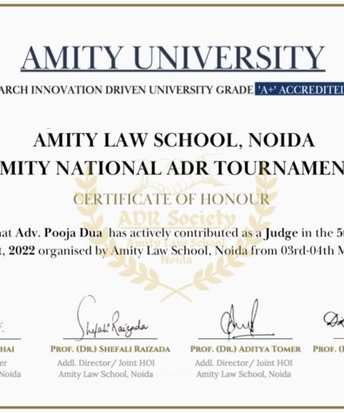 Adv. Pooja Dua, Founder of the Law Chambers of Pooja Dua, was invited to serve as a Judge at the 5th Amity National ADR Tournament, 2022..